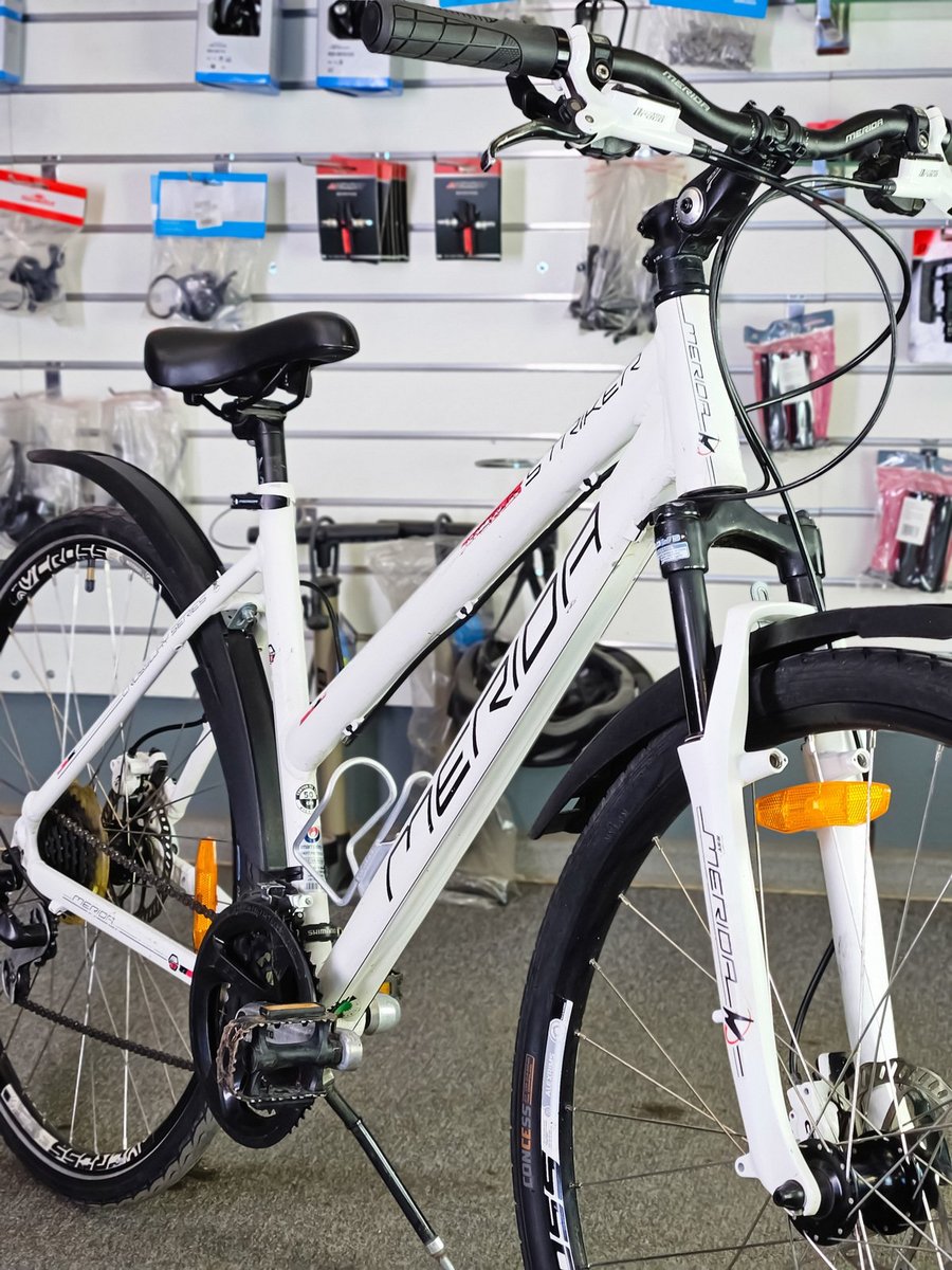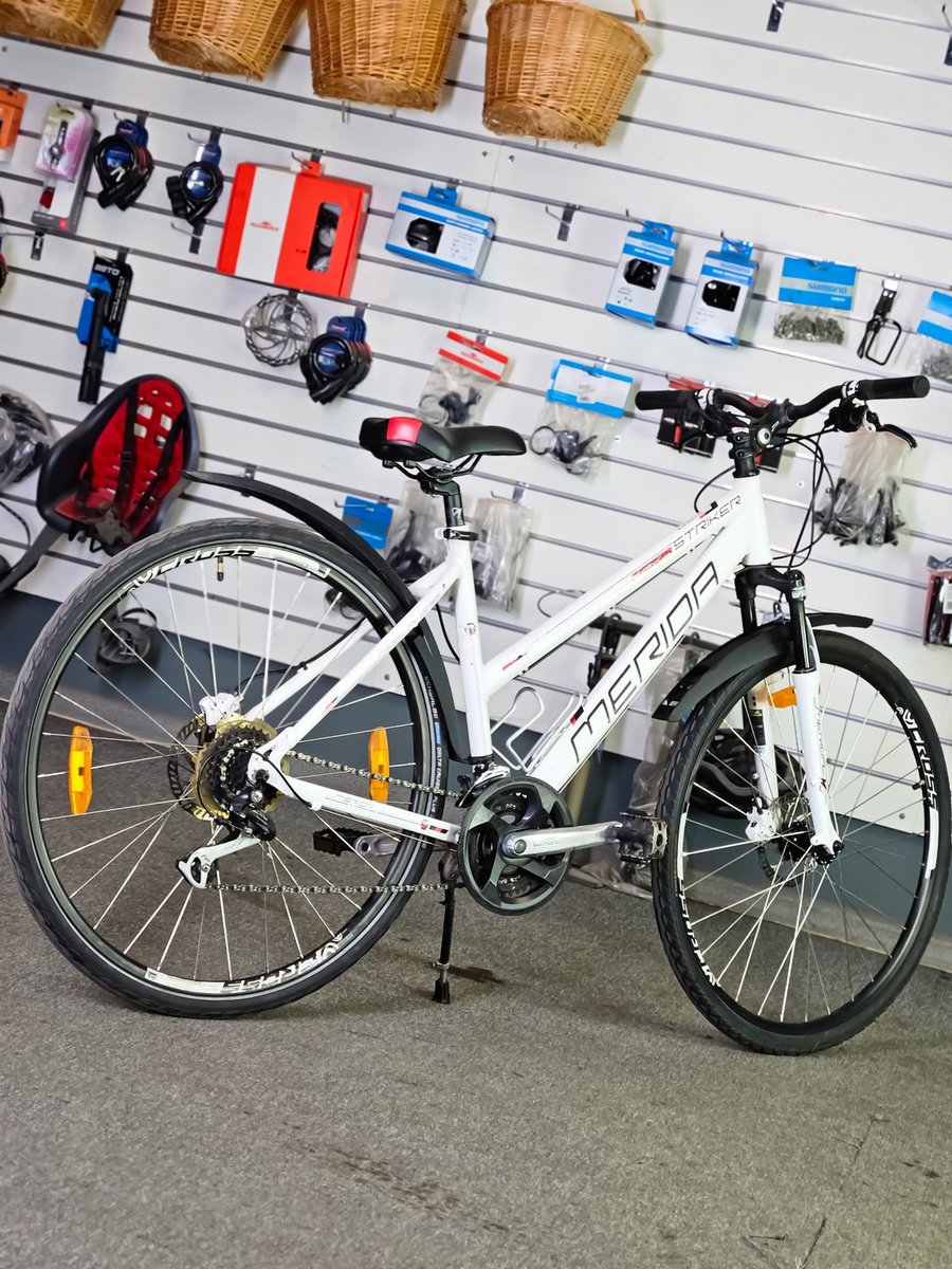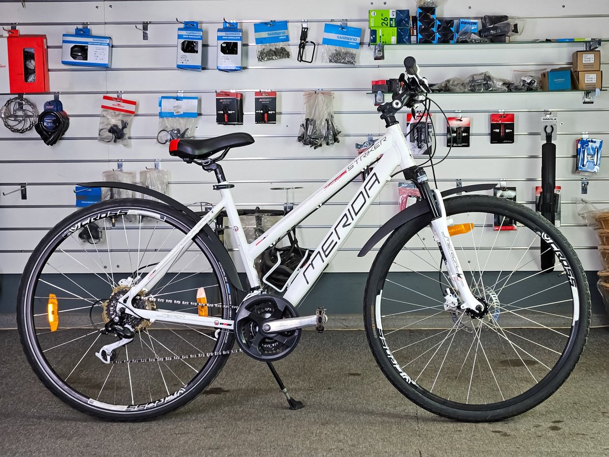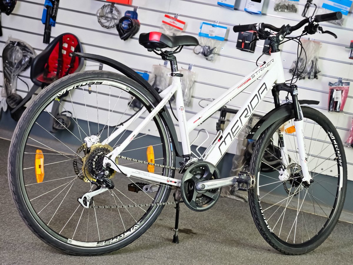 Merida Striker sērijai. Tas ir daudzpusīgs velosipēds, kas apvieno kalnu un pilsētas velosipēdu īpašības, padarot to piemērotu gan ikdienas braucieniem, gan vieglākiem meža ceļiem.